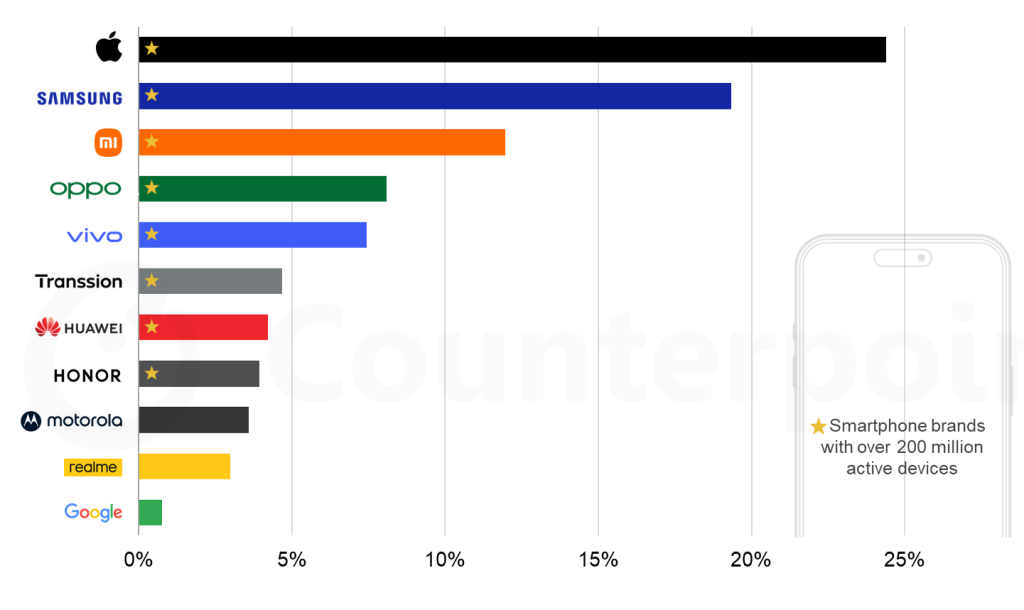 Selon Counterpoint, environ un smartphone actif sur quatre était un iPhone en 2025, tandis que Samsung se situerait autour d’un cinquième. Ensemble, Apple et Samsung représenteraient 44 % de la base installée mondiale, et seraient les seuls constructeurs à avoir dépassé le milliard d’appareils actifs.